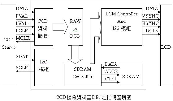 CCD部分是以I2C方式控制,由I2C產生CCD 模組所需的時脈,而CCD 擷取資料產生第一個模組所需的時脈。當資料擷取後,所擷取的資料為RAW格式,須將此格式轉換為RGB格式才能顯示在LCD上。轉換後的資料經由SDRAM Controller存入SDRAM,此為Multi-Port輸入,因此資料會不停地依序輸入與輸出。在LCD 模組控制上,採用的是I2S控制驅動,並將所轉換的像素由列至行依序顯示在LCD面板上。