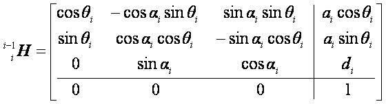 5. 運動學: 運動學可分為順向運動學與逆向運動學;順向運動學為給定各關節之旋轉角度,進而求得末端連桿在絕對座標系中的空間位置;逆運動學為給定末端連桿在絕對座標系中的空間位置,反過來求解各關節的旋轉角度,本作品是採用D-H連桿座標系來表示各關節座標系統,再以幾何關係推導反向運動學。其中會使用大量的三角函數,為了加快運算數度,將常用的三角函數建表,採用查表法來減少運算時間。D-H連桿為: