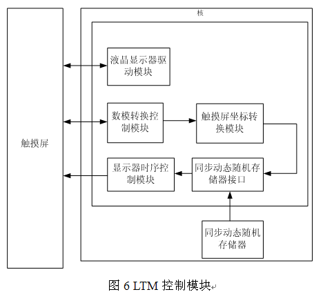 如图6所示,液晶显示器驱动模块驱动LTM工作,数模转换控制模块和触摸屏坐标转换模块确定触摸屏的坐标位置和所要执行的命令,同时提示同步动态随机存储器接口模块从SDRAM模块中读取所需要的数据。显示器时序控制模块用来控制在LTM的实时显示功能,下面对主要模块的时序进行简要介绍。