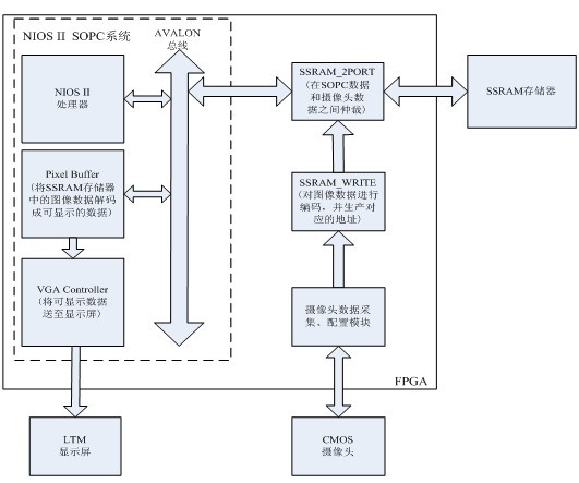 系统设计中把摄像头、LTM显示、PS2等功能模块都定制成SOPC系统中的用户自定义模块,添加到SOPC中,使系统具有高可剪裁性。