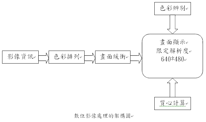 結合以上所有的條件,我們就可以將物件的位置取出。下列將說明數位影像處理幾個基本的處理方式:首先輸入一張影像,經過本系統對這張輸入的影像取出特徵而得到一張輸出的影像,完成整個數位影像處理的動作,如下圖所示。