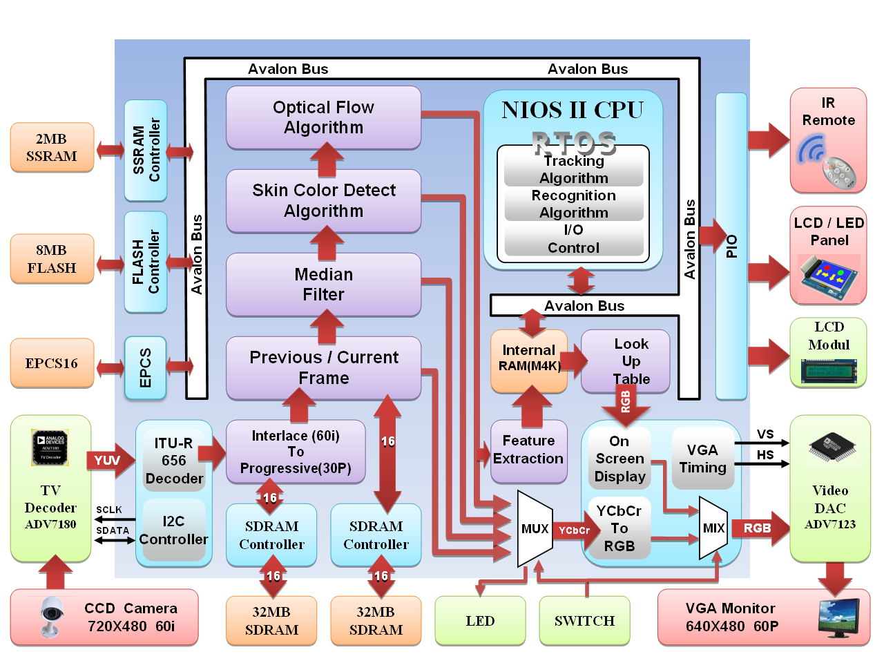 本作品採軟硬體共同設計的方式,完成一套高性能的即時影像辨系統。該系統整合數個不同的智慧型演算法以提昇系統之運算效能。演算法實作的部份主要可分為三種模組:硬體模組、軟核心模組與自定義模組,其實現方法分述如下: