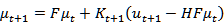 手勢追蹤主要目的為記錄手移動的軌跡以供後續手勢辨識使用,追蹤時須滿足準確性與流暢性。為了達到追蹤之準確性,本作品使用卡曼濾波器(Kalman filter)進行追蹤,追蹤過程將以密度區塊方式進行搜尋,藉此可避免單點極端值影響。膚色範圍的光流密度最大區域是從自定義模組3×3、5×5、7×7區塊的特徵值暫存器取得,計算平均強度,以最強區塊質心位置為中心點,隨著時間推演記錄其中心點之移動軌跡,追蹤軌跡如圖12所示。其中F為狀態轉換矩陣,代表手勢質心位置的移動模型,本作品選擇加速度模型;u為手勢質心位置,H為觀測矩陣,表示推測值與實際值間的關係;S為轉換矩陣共變異數,K為卡曼增益以公式(11)計算。以卡曼濾波器追蹤,記錄軌跡,得到平滑軌跡。